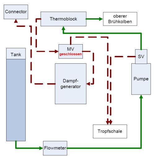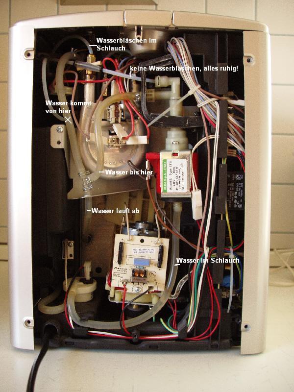 Der am Foto vermeerkte Schlauch in dem kein Wasser ist ist eigentlich nur der Überdruckschlauch nach der Pumpe, falls Verstopfung vorliegt wird üner Ventil in die Pumope abgeleitet, wenn dort kein Wasser rinnt ist der Thermoblock noch nicht ganz verstopft sonst würd dort schon das Wasser abrinnnen.