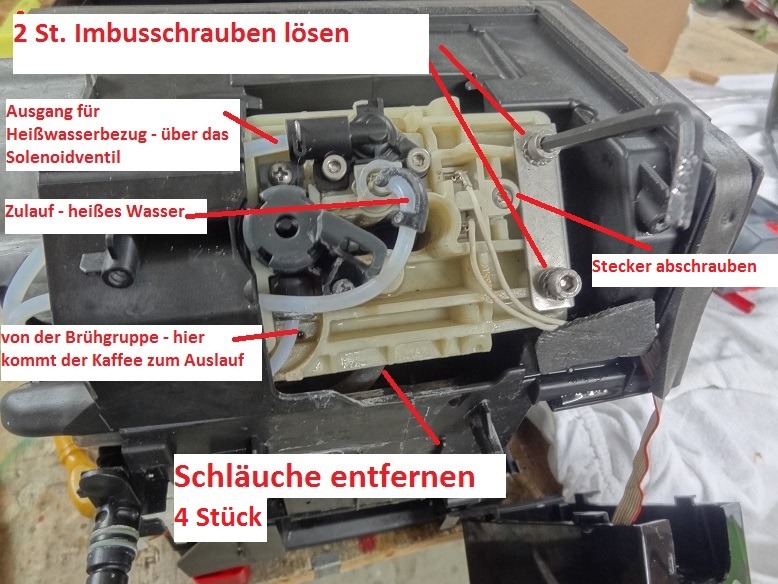 Festgestellt habe ich, dass beim Starten ( Drücken auf die Taste mit einer Schale) sich die Pumpe kurz einschaltet und das heiße Wasser aus dem scharzen Schlauch mit dem roten Hitzeschutz ( rechter Pfeil) fließt. Vorher gings eben durch den Schauch in die Tropftasse.