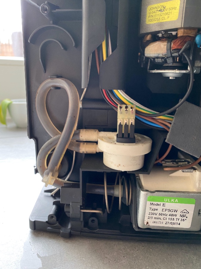 nachdem ich meine Maschine einmal aufgemacht habe, habe ich festgestellt, dass zwei Schläuche hinter dem Wassertank keimig sind. Schlauch jeweils vom Wassertankauslass zum Flowmeter und von dort zur Pumpe. Danach ist das Wasser und die Schläuche allerdings klar.