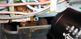 • Zwei Schrauben lösen und die Abdeckung abziehen. Eine Schraube ist oben links neben den schwarzen Schlauch, eine mittig neben den Wassertank in reiner Vertiefung. Alles von vorne gesehen. Beides Kreuzschlitz.