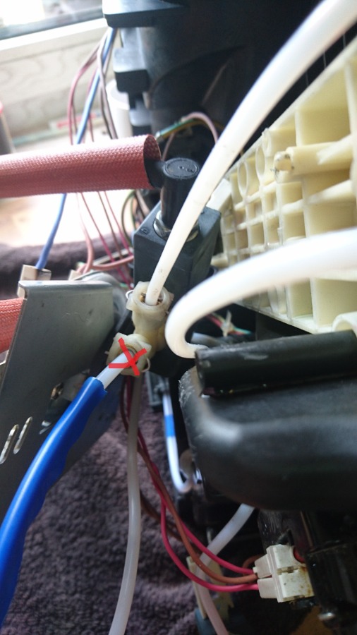 • huhu der Schlauch den ich in der Hand habe da kommt Wasser (gleichzeitig anfangs auch vom schwarzem Schlauch) Der kommt in das schwarze teil der Kupplung siehe roter Strich und kommt aus dem Magnetventil oben siehe rotes Kreutz (kann es leider nicht besser zeichnen)hoffe du weist was ich meine.