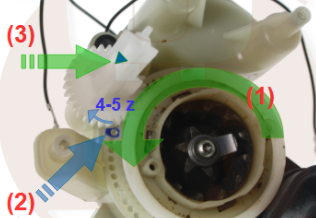 Den Mahlring (1) so stellen, dass die werkseitige Markierung (2) so steht wie auf dem Bild zu sehen. Die Mahlgradverstellachse (3) hat oben eine kürzere Seitenflanke( ). Die Mahlgradverstellachse sollte dann so stehen dass diese ca. 4-5 Zähne von der blauen Markierung (2) auf dem Mahlring entfernt ist.