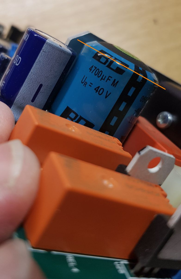 Auf der Steuerung war auch der dicke Kondensator schon ordentlich gewölbt und prall wie ne Hafendirne, die Elkos habe ich also auch gleich alle getauscht. Die orangene Linie zeigt, wie der Deckel eigentlich aussehen sollte: