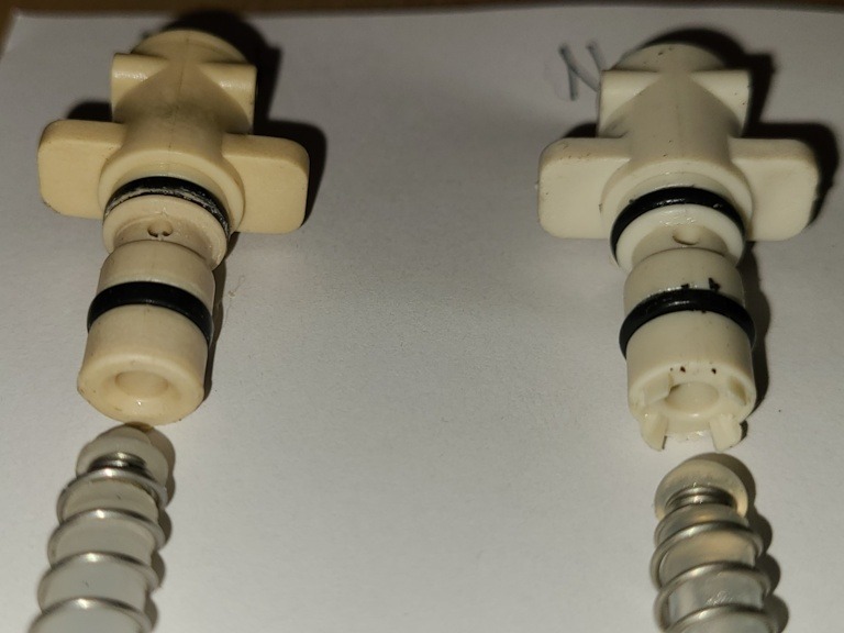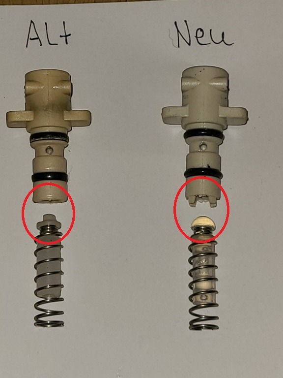Da ich sämtliche Löcher und Durchgänge am kompletten Brühkolben getestet habe und keine Unterschiede zum alten Brühkolben feststellen konnte und diese "neue Bauweise" (fast) der einzige Unterschied war, habe ich nun einfach in den neuen Brühkolben das alte Rückschlagventil übernommen. (Wow - was ein Satz).