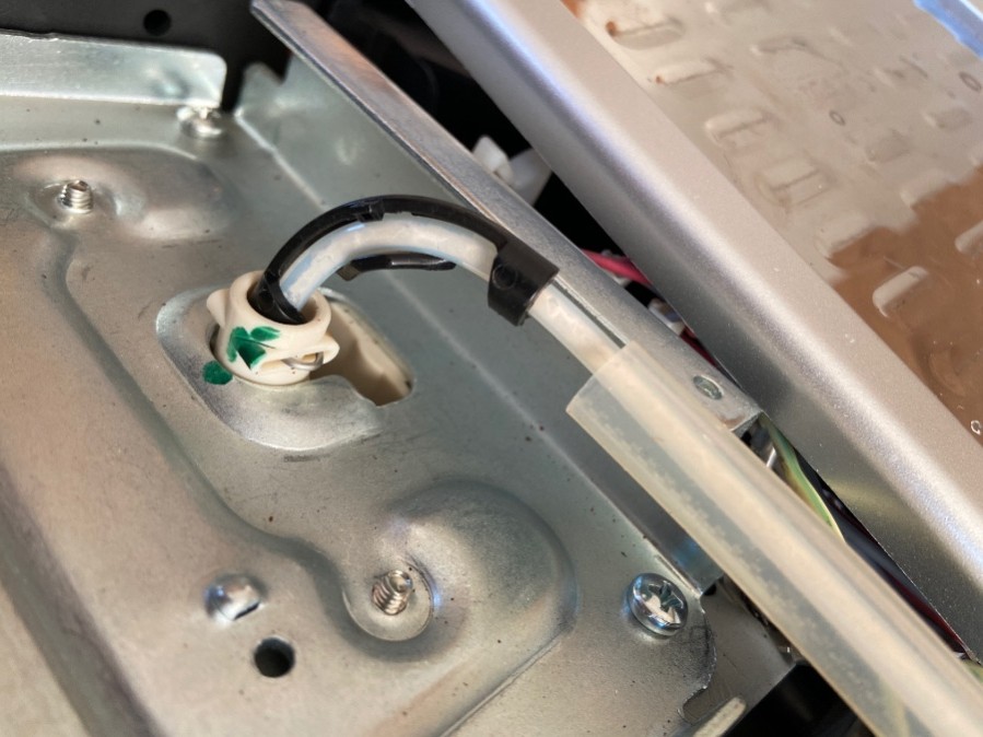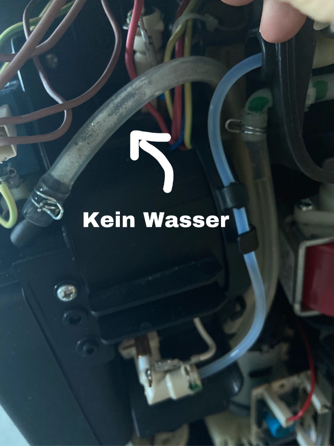 Ich habe mir hinten mal die Schläuche angeschaut, das Wasser wird auf jeden Fall in die Pumpe „gezogen“. Der große (untere) Schlauch, der aus der Pumpe wieder herausgeht ist allerdings nicht mit Wasser gefüllt, hier kommt auch keins durch. Gestern habe ich hier noch einmal beide Schläuche abgemacht und der (obere) kleine Schlauch ist mir um die Ohren geflogen, da hier so ein großer Druck drauf war.