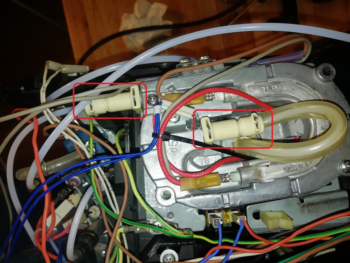 • an den beiden Anschlüssen am Thermoblock direkt, wo die Doppelten Dichtungsringe mit den Distanzen sitzen ist alles dicht. Es fließt z.B. an dem Schlauchende, das in den oberen Brühkolben hereingeht raus. Ich ordere mir jetzt mal ein paar Dichtungen neu.