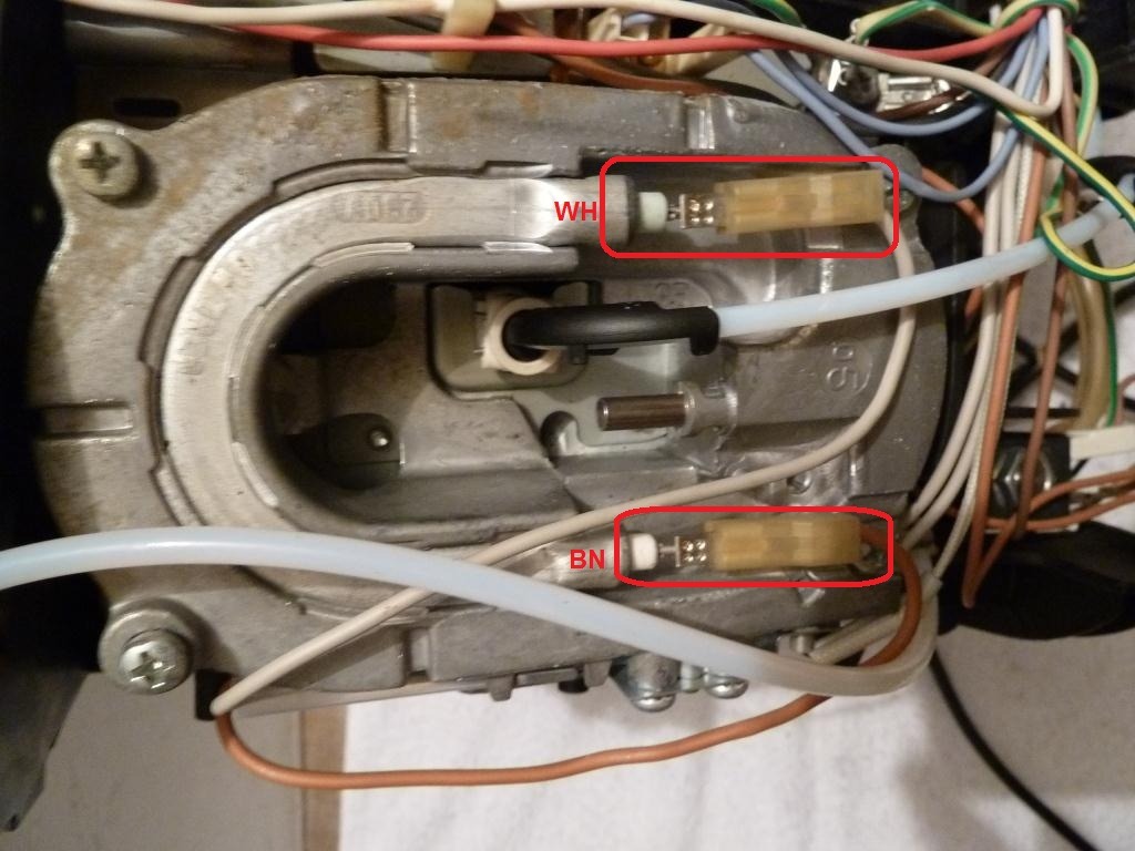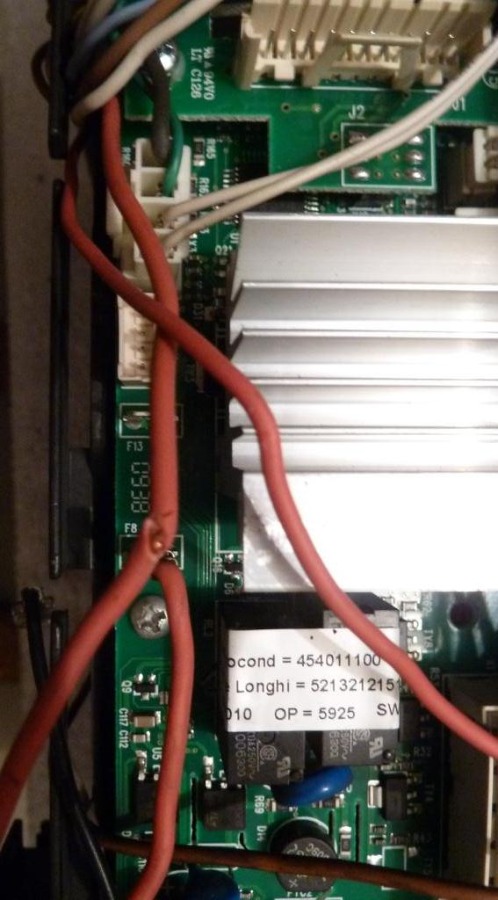 Da ist noch ein 2-pol. Anschluß "X5" auf der Platine - zu finden in der Nähe des Kühlkörpers). Geht das dort angeschlossene Kabel zum Wassertank (Reed-Kontakt). Könnte ein "weißes" Kabel sein -> Ist der Sensor für den Wassertank.