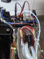 Könnte an einem der beiden Thermosicherungen liegen, die da angeschraubt sind. Mascht aber auch nix. Die Spannung können wir auch so messen, und zwar direkt an der Platine.