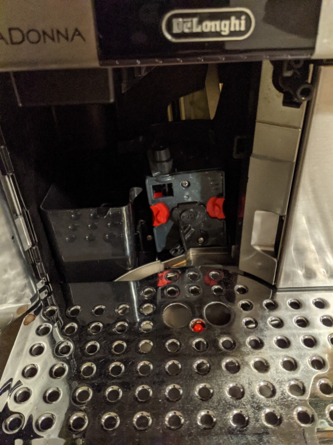 Zweites Beispiel: "Motor up", die Brühgruppe fährt in die obere Endlage. So wie es sein muss und bleibt in dieser Position stehen, durch die Funktionalität des Endlagenschalters. "Motor down", die Brühgruppe fährt in die untere Endlage und bleibt stehen. Die Tropfschale jedoch kann nicht entnommen werden. Die Brühgruppe ist zu weit gefahren. Es ist fast unmöglich dieselbige in die Lage manuell zurück zusteuern, dass die Tropfschale entnommen werden kann. So wie jetzt. Der Rest des Teleskopartigen Gebilde, bleibt "draußen" und ich weiß nicht wie ich den Ursprung, das heißt Ausgangsposition wieder herstellen kann.