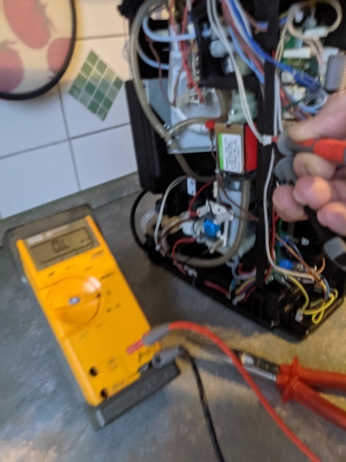 Folgende Komponenten könnte man, nach einem Funktionstest, ausschließen: Magnet Wassertank, Flowmeter, Magnet Pumpe (neu), Antrieb Brüheinheit (kpl.neu) = inhaltlich beide Endschalter+Motor+Hallsensor, Mahlwerk, Schalter Tür+Tresterbehälter+Tropfschale, EV1+EV2 (neu), Thermoblock kpl. mit Brüheinheit (neu). Soweit, so gut, es verbleibt der Erhitzer für Dampf und Heißwasser und beide Thermistoren 318°. Letzteres ist neu. Der Erhitzer wurde als OK befunden, da der Widerstandswert als solches stimmte. Trotzdem könnte hier ein Verdrahtungsfehler vorliegen. Dies kann ich nicht überprüfen. Hierzu benötigte ich eine (vergrößerte) Anschlussbelegung. ( von PCB nach ?, F5, F6, F11, F12 )