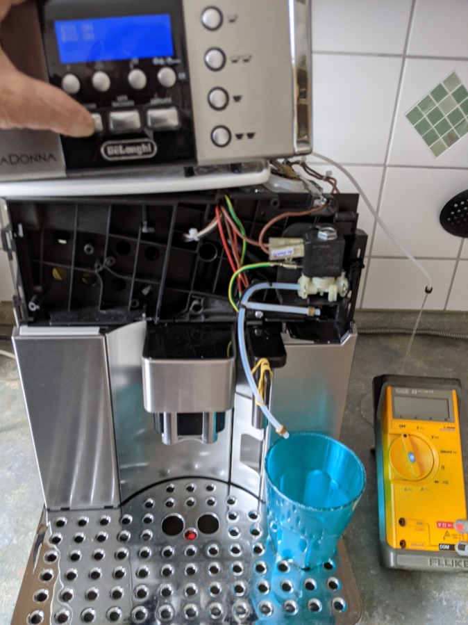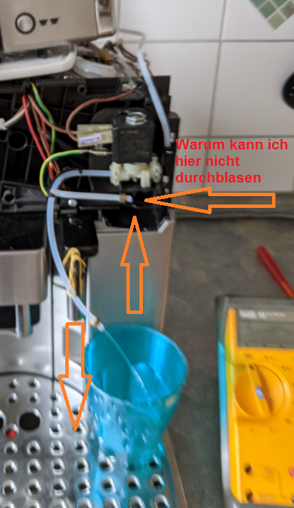 Maschine aus, Zusatzkabel angeheftet. Im Testmode Funktionen überprüft. Schlauch vom Ausgang Thermoblock an EV-1 gelöst. Wasser läuft - wesentlich stärker. Um dies zu prüfen, habe ich versucht das Schlauchende mit mit einem Finger zu zuhalten. Gestern ist mir das gelungen, heute nicht. Der Schrank war nass.