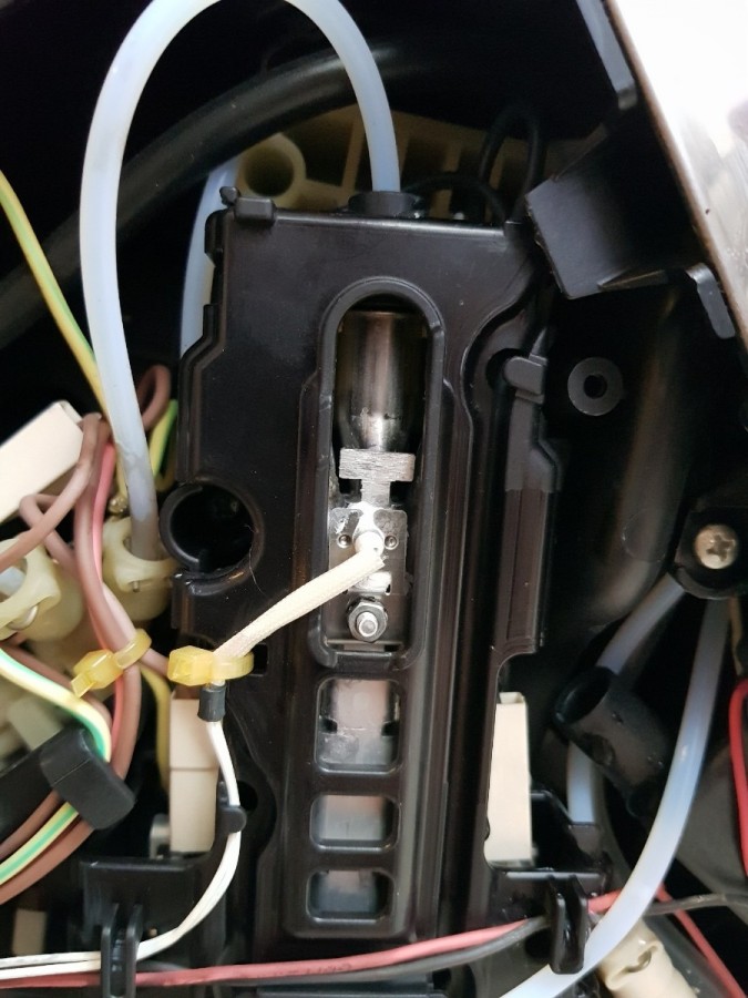 Daraufhin habe ich die Maschine auseinander geschraubt und festgestellt dass beim Dampferhitzer Wasser austritt. Nochmal das entkalkungsprogramm laufen lassen,