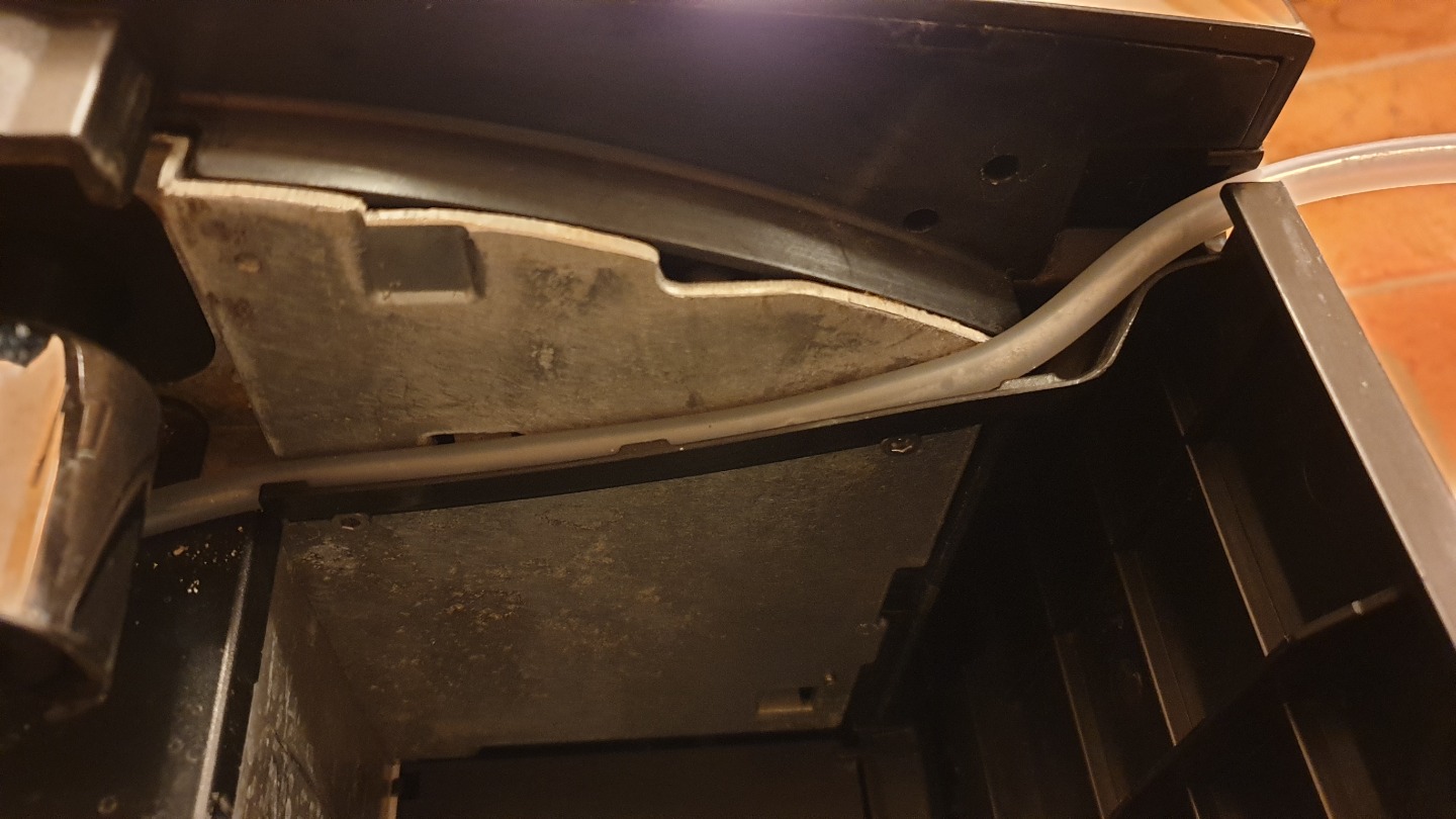 Bei Übernahme der Maschine hing der besagte Milchschlauch nur am All-In-Auslauf und war nicht nach rechts in die Aussparung verlegt..