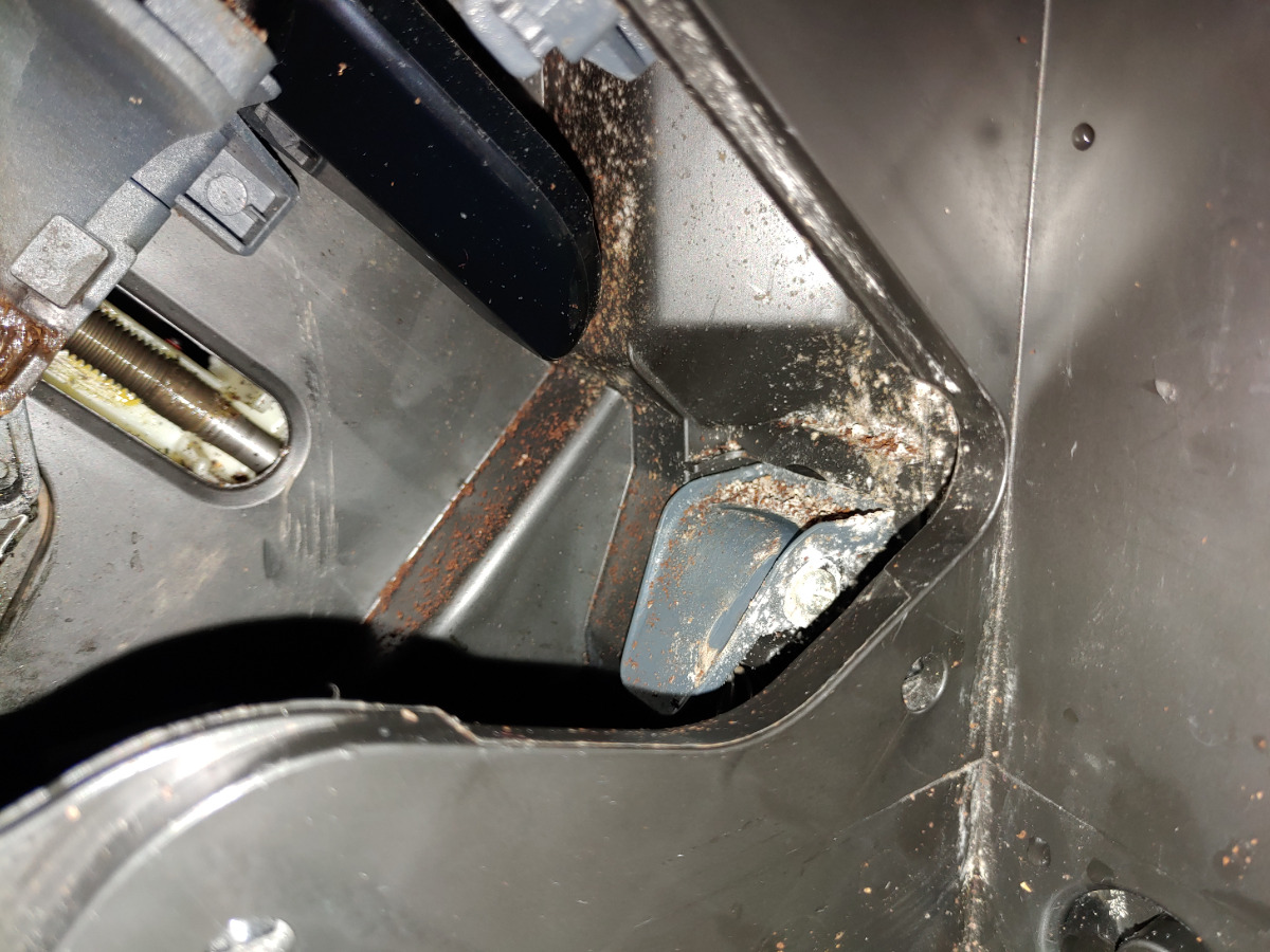 Der Verkäufer hat die Maschine regelmäßig entkalkt und gewartet, von außen sieht sich auch wirklich gepflegt aus. Als ich die Brühgruppe zum Abspühlen entnommen habe, dachte ich, mich trifft der Schlag: Fast der gesamte innere Teil war mit weissen Flecken übersät, welche verdächtig nach Schimmel aussehen.