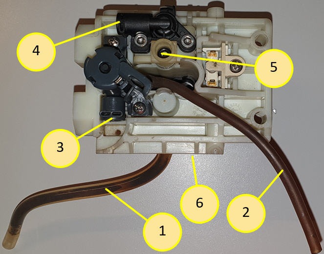3. Hier ist der Schlauch angeschlossen, über den der Kaffee von der Brühgruppe kommt. Der ist also mit Anschluss 1 der Brühgruppe verbunden.
