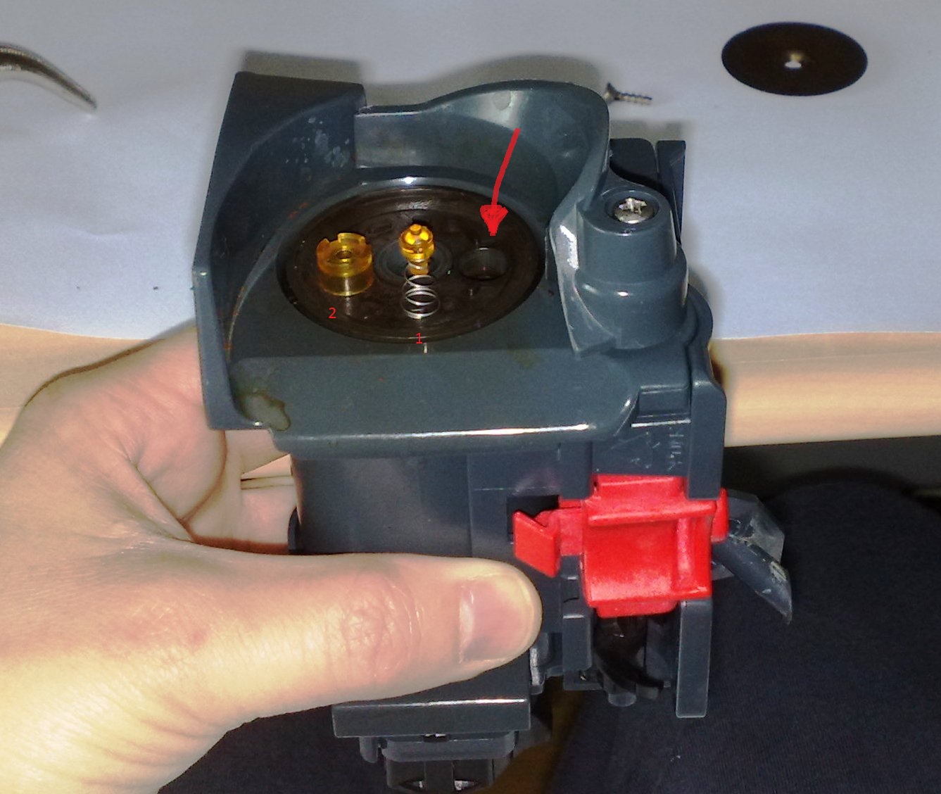 also oben Sieb weg, dann das Teil (1) mit der Feder nach unten in das Loch, danach das größere Teil (2) draufsetzen,