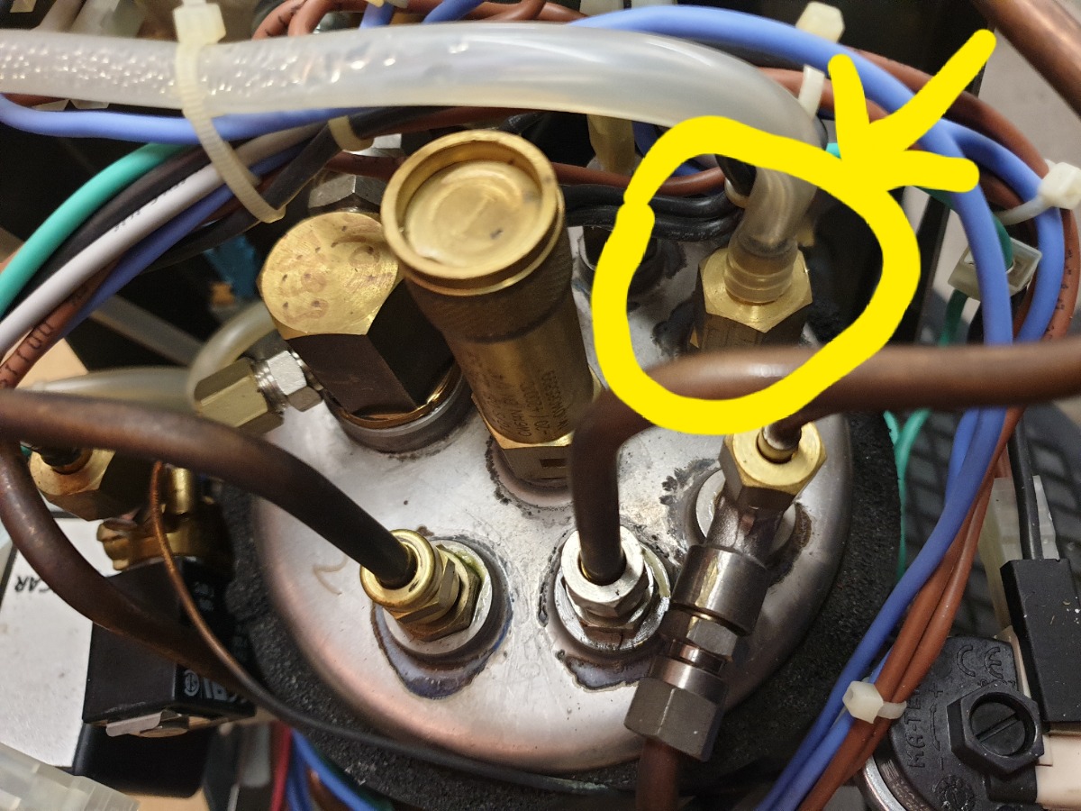 Der Schlauch geht auf ein Bauteil oben am Boiler.