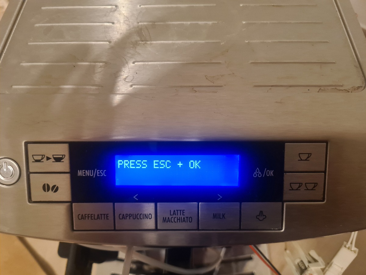 • Hallo mein Name ist Simone und ich habe ein Problem mit meiner lieben DeLonghi ECAM 26.455. Es begann für eine Weile Anzeichen dafür zu geben, dass es beschädigt wurde, da es sich manchmal, besonders wenn die voreingestellte Zeit der Inaktivität abgelaufen war, ausschaltete und versuchte, die automatische Spülung durchzuführen, aber sobald das Sieb den oberen Rand erreichte, spülte es nicht, weil die Maschine Signal zum Einsetzen der Brühgruppe, ich habe es gelöst, indem ich den Wasserbehälter geöffnet und geschlossen habe, auf diese Weise ausgeschaltet und wieder eingeschaltet, alles funktionierte korrekt. Dies bis vor 3 Tagen, danach erschien selbst beim Öffnen und Schließen des Wassertanks die Meldung "Brühgruppe einsetzen" jedes Mal erneut, wenn die Brühgruppe zum Spülen oben ankam. Ich öffnete das Auto und versuchte zu sehen, ob der Endschalter funktionierte. Das funktionierte tatsächlich, indem man im richtigen Moment drückte, das heißt, als die Brühgruppe oben ankam, lieferte sie Wasser zum Waschen. (Ich habe es geschafft, ungefähr zehn Kaffees zuzubereiten, indem ich es manuell gedrückt habe, dann erschien plötzlich die Meldung press esc + ok auf dem Display) Ich habe versucht, diese 2 Tasten zu drücken, aber nichts, die Maschine tut nichts mehr. Ich bedanke mich im Voraus bei denen, die mir helfen oder es zumindest versuchen können.