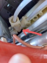 • Vielen Dank für die Ideen. Ich habe den Thermoblock abmontiert. Dahinter befindet sich ein weißes, abgeknicktes Verbindungsstück. Und genau aus dem Knick scheint immer beim Milchschäumen ein Tropfen Wasser rauszulaufen (siehe Foto). Würde das für einen Haarriss sprechen? Und welche Teile sollte man in dem Fall austauschen?