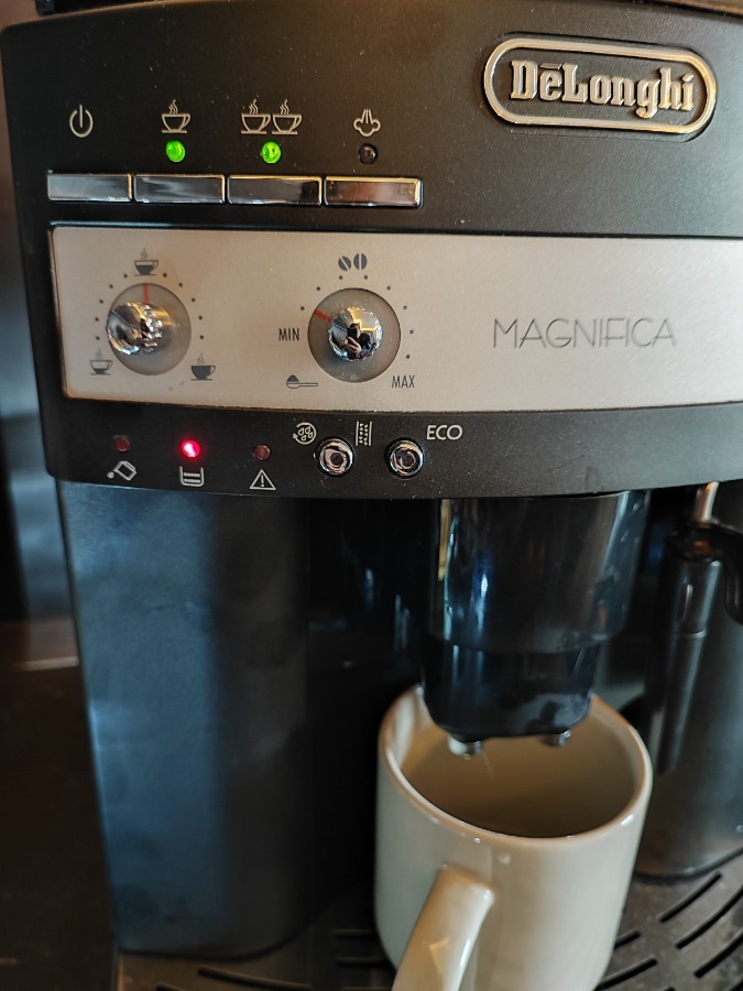 Leider bereitet die Maschine aber noch keinen Kaffee zu. Es leuchtet direkt nach dem Einschalten die rote Kontrolllampe für das Kaffeepulver.