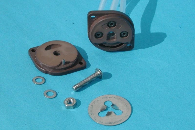 1 M4 20mm lange Schraube mit selbstsichernder Mutter, 2 4er Unterlegscheiben und 1 Federscheibe aus V2A.