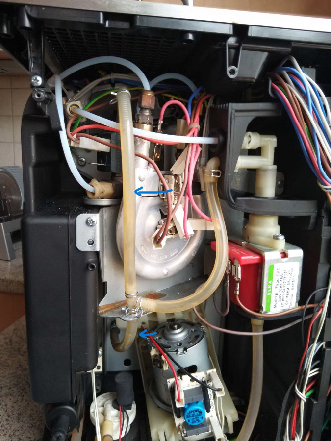 Hallo zusammen, vielen Dank für die Tipps. Der schwarze Schlauch unten ist o.k. Da geht das Wasser durch. Aber bei dem Schlauch auf der linken Seite läuft etwas Wasser durch wenn der Kaffe zubereitet wird. Ich habe da mal ein Bild dazu gemacht.
