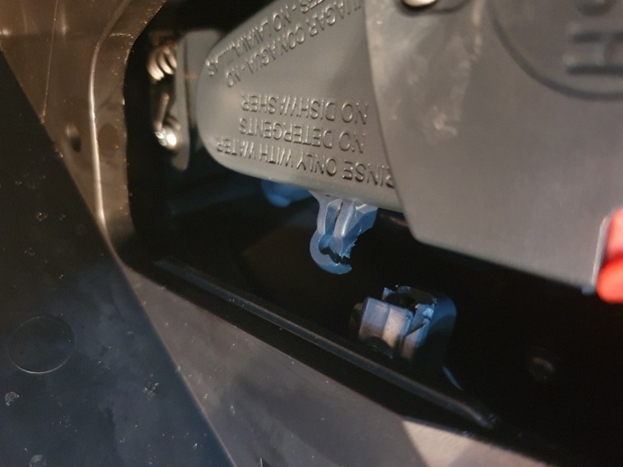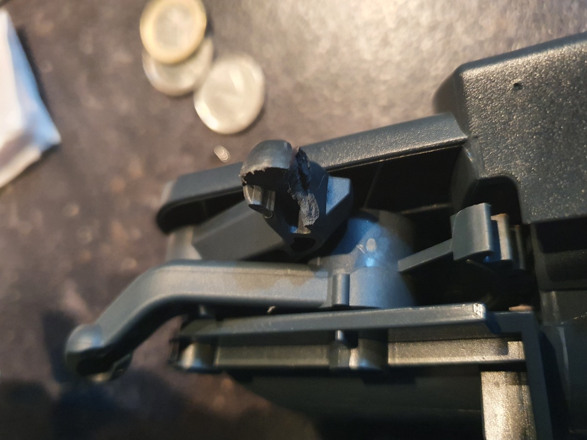 Hierbei habe ich leider die beiden "Führungshebel" unten falsch zusammen gebaut, eingesetzt und es hat zweimal laut geknackt. Soweit ich sehen konnte ist der kurze Hebel von der Brühgruppe vorne gebrochen und ein kleines Innenteil auch gebrochen. (siehe Bilder).