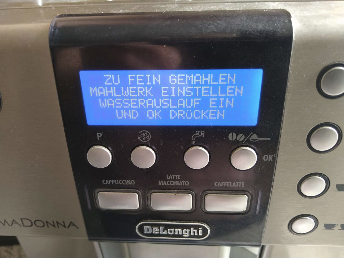 Auf dem Display steht:" zu fein gemahlen Mahlwerk einstellen Wasserlauf ein und ok drücken"