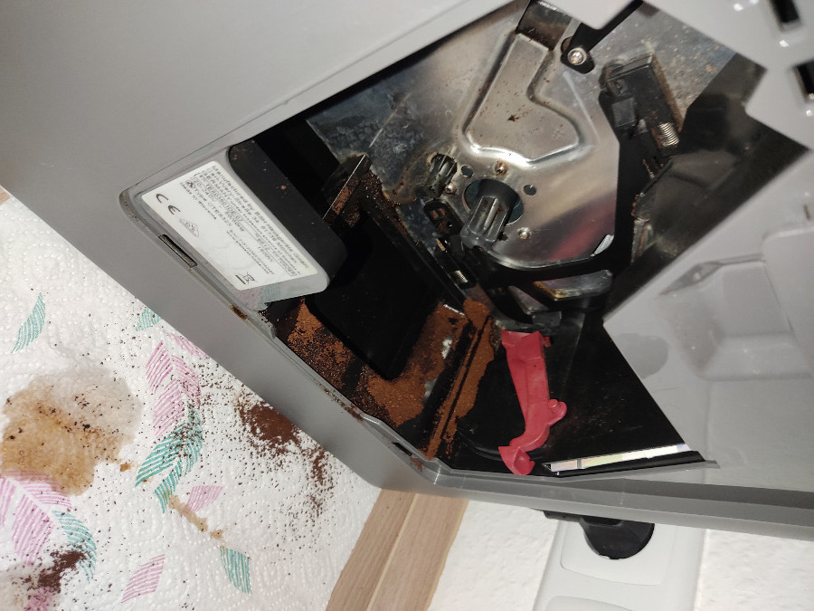 Jedenfalls stellte ich am Ende noch fest, dass der Trichter vom Mahlwerk für den Kaffee komplett zugesetzt war. Ich hoffe hier war das Problem mit dem Kaffeesatz um der Brüheinheit.