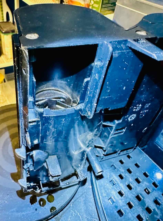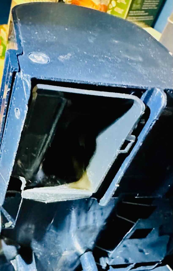 Eben beim Einschalten hat meine Corso interessante Geräusche gemacht. Die Tür ließ sich daraufhin nur mühsam öffnen. Beim Öffnen fiel mir ein Teil entgegen, das wohl normalerweise in die Tür gehört und den Kaffee von der Brühgruppe zum Auslauf leitet. Ich weiß den Fachbegriff nicht.