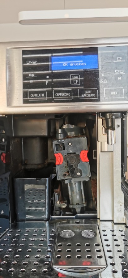 Es wird kein Spülvorgang durchgeführt und es erscheint sofort die Meldung ok drücken. Die Brühgruppe steht oben