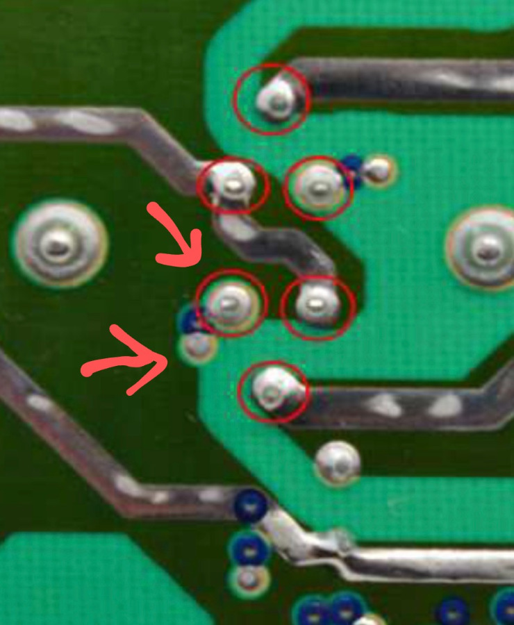 Leider ist mir beim entlötrn von dem alten Triac der Leiterplatte von der markieren Stelle abgebrochen. Ist wahrscheinlich zu heiß geworden.