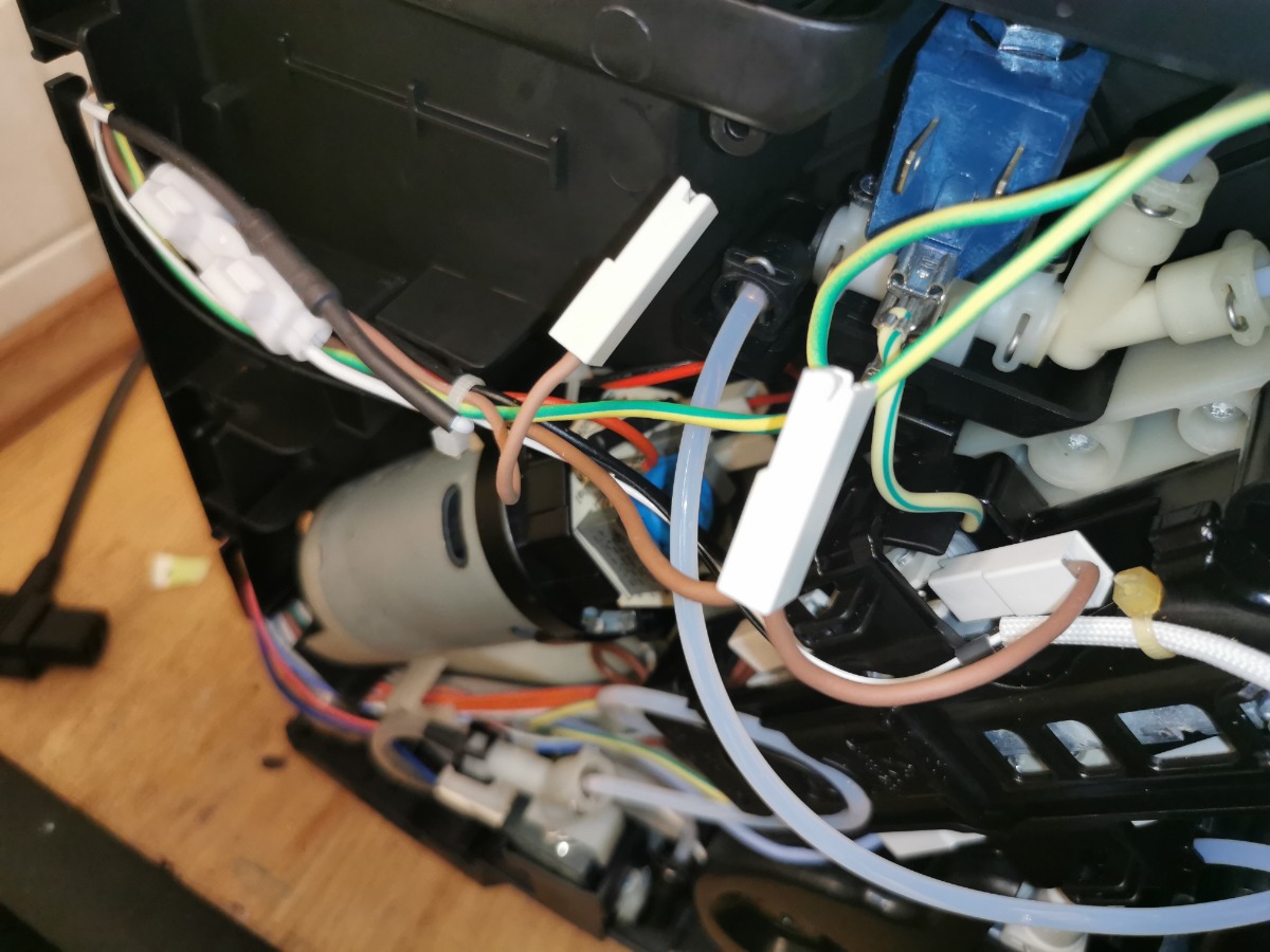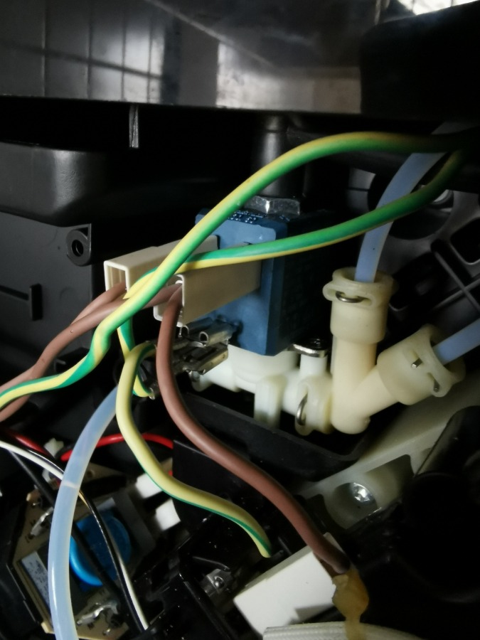 Ich habe deshalb die Maschine geöffnet und nach Hinweisen aus dem Internet sowohl den Milchbehälter mit Aufschäumer sowie auch die Kupplung/den Connector zum Milchaufschäumer getauscht, aber es hat nichts geändert. Auffällig ist, dass wenn Milchschaum erzeugt werden sollte, der Dampf unten an der Stelle, auf die mein Finger auf dem Bild zeigt, herauskommt. Auf mich als Laie wirkt das so, dass zwar Dampf richtig erzeugt wird, aber irgendein Ventil öffnet dann wohl nicht und statt Dampf wird warmes Wasser zur Kupplung geschickt.