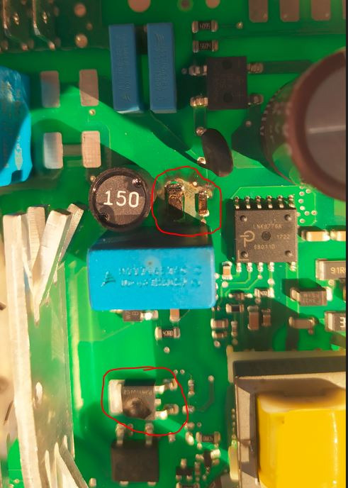 Ich habe sie heute auseinander genommen und auf der Elektronik 3 defekte SMD-Bauelemente optisch ausmachen könnnen - siehe Foto - wo aber leider die Bezeichnung nicht mehr erkennbar ist.