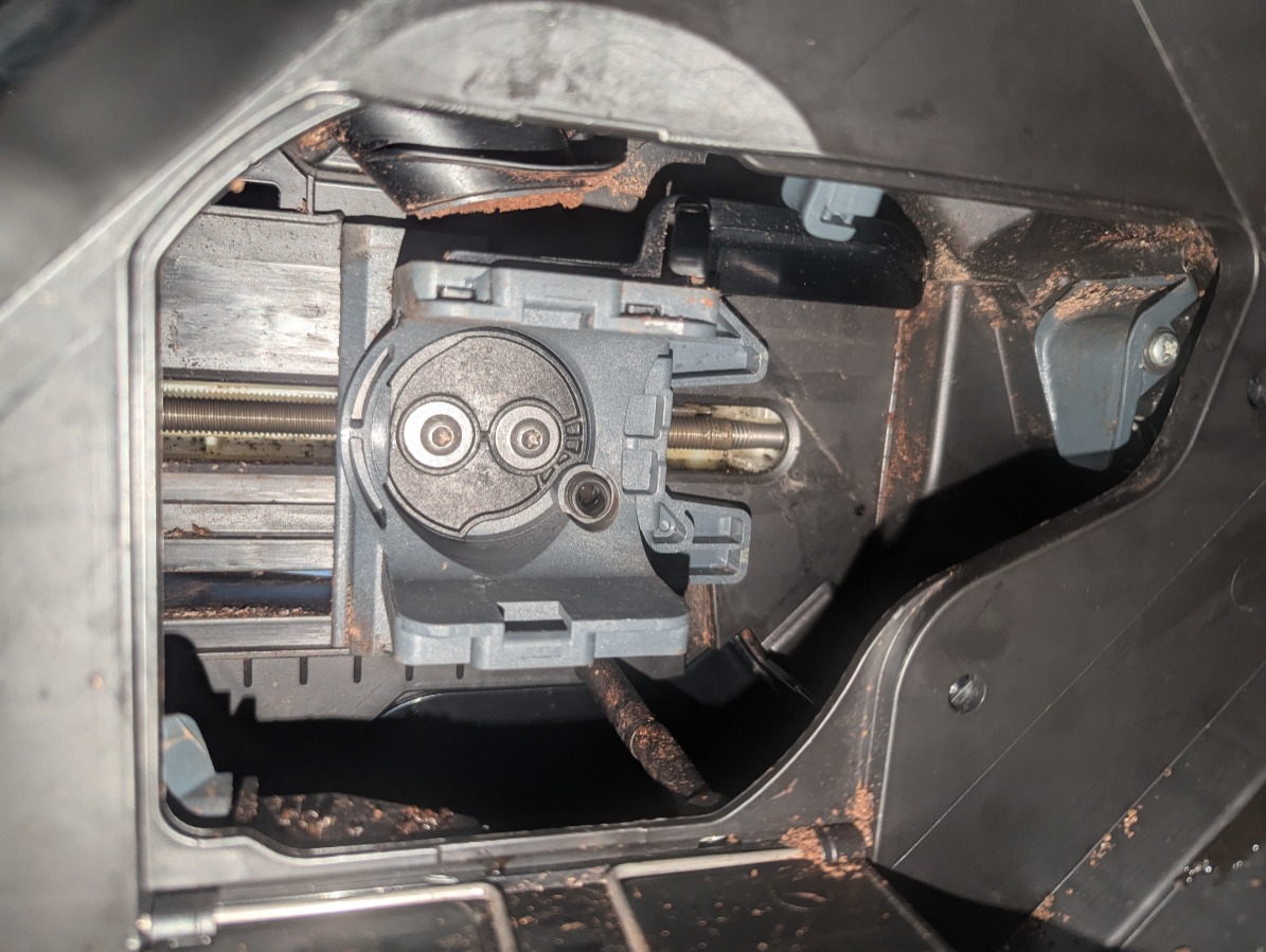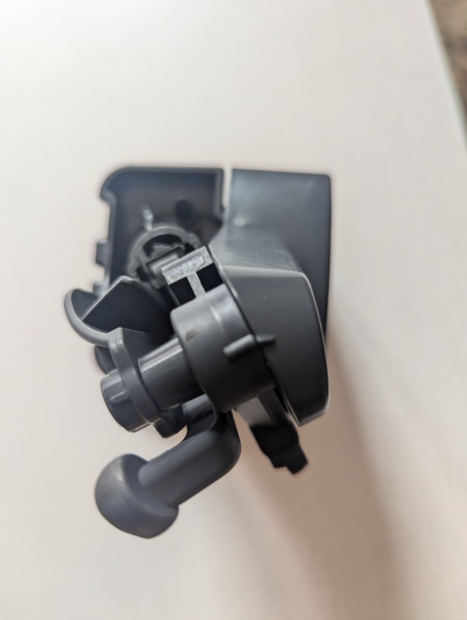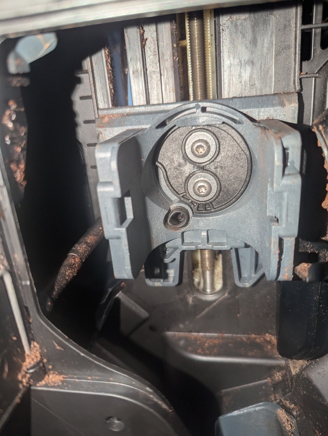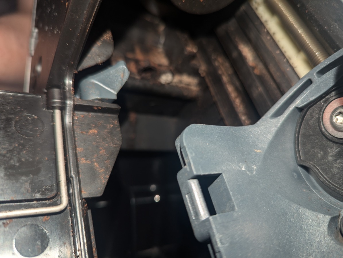 ich habe mal ein Foto gemacht und hoffe, damit den Abstreifer mit abgebildet zu haben. Im ausgeschalteten Zustand und entnommener Brühgruppe bewegt sich das Teil nicht. Ich wollte da nichts kaputt machen und deswegen nicht stärker daran gerüttelt.
