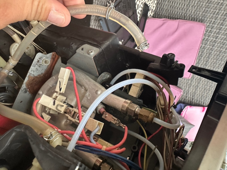 Nachdem entkalken meiner Prima Donna Avant 6700 hat es die letzten Male einen Kurzschluss gegeben. Nach dem Öffnen der Maschine, habe ich entdeckt, dass der Schlauch oben leckt. Das ist ein etwas dickerer Schlauch mit Drahtfeder drin.