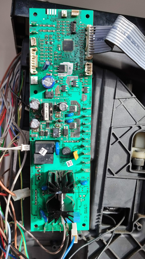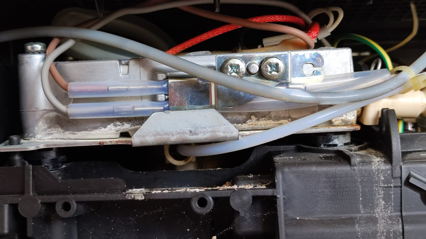 Spannung 230V geht vom Hauptschalter weiter zu der Platine an der Seite.