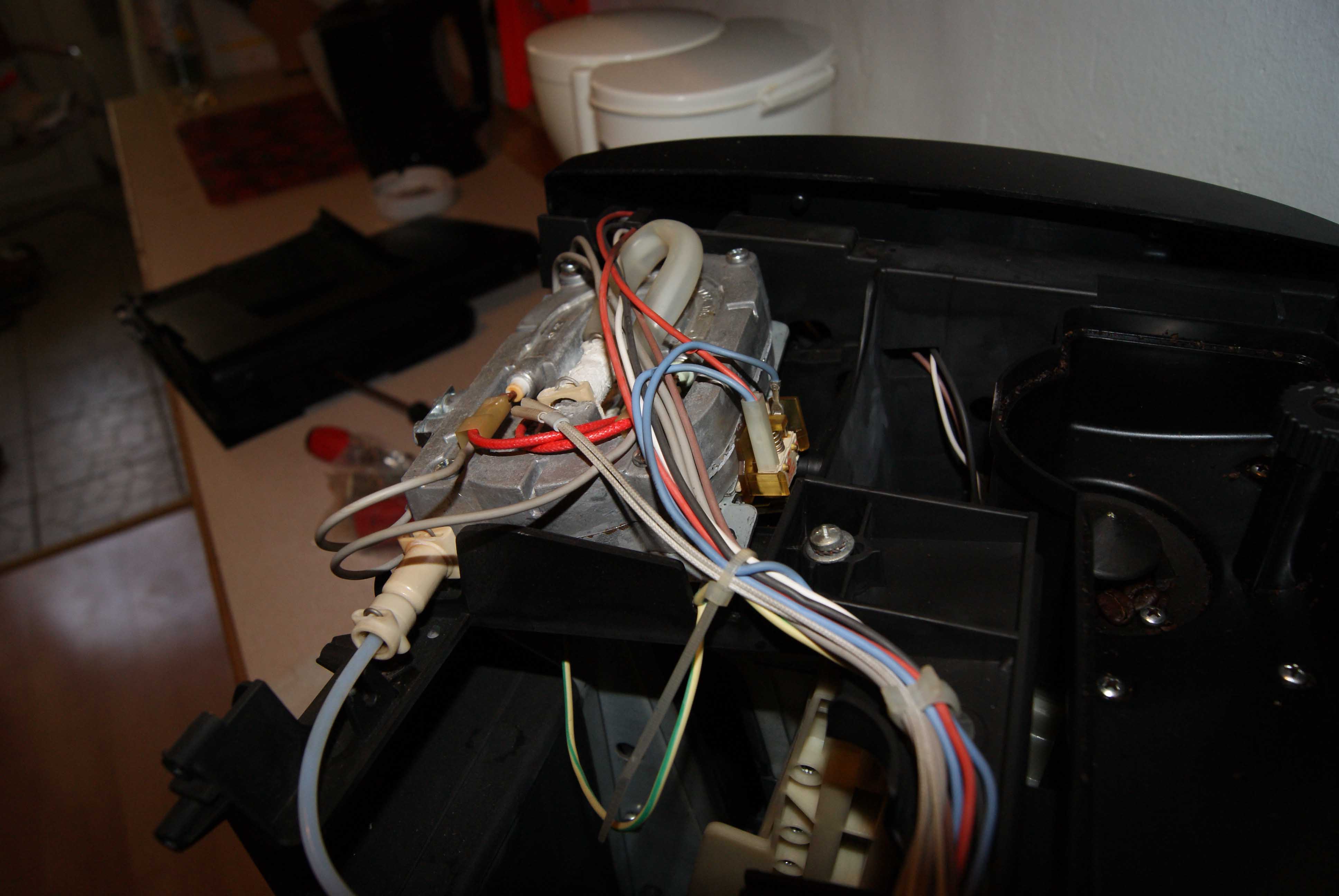 Leider kann man den Thermoblock der ESAM-Modelle nicht mehr in 2 Hälften zerlegen, ich vermute nämlich, dass es im Inneren nicht gut aussieht (viel Kalk). In Entkalker darf man das Teil wegen der Heizungen aber auch nicht baden, diese wären dann beim nächsten Einschalten sofort kaputt (sind nicht wasserdicht).