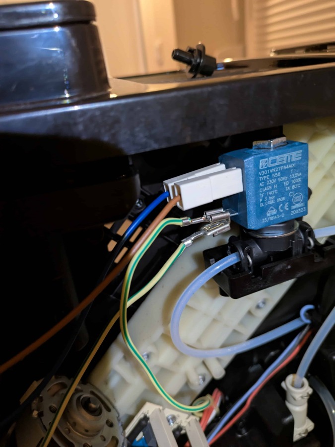Nachdem ich ca. 15 Neustarts versucht hatte, habe ich beschlossen das Gerät zu öffnen. An der offenen Maschine habe ich manuell die Welle gedreht, damit die Brüheinheit hochfährt, bis ich diese entnehmen konnte. Anschließend habe ich die Brüheinheit und das gesamte Innere der Maschine gesäubert. Alles wieder zusammengebaut und die Maschine neu gestartet. Ich habe gehört wie die Brüheinheit nach unten fuhr dann kam wieder die Fehlermeldung. Anschließend habe ich die Brüheinheit wieder manuell hochgedreht und herausgenommen. Ein Neustart ohne Brüheinheit kam zum selben Ergebnis. Die Schlitten der Brüheinheit fuhr herunter und es kam die Fehlermeldung. Meine Schlussfolgerung war, dass der Schlitten immer so weit runterfährt, bis dort ein Sicherungsschalter berührt wird.