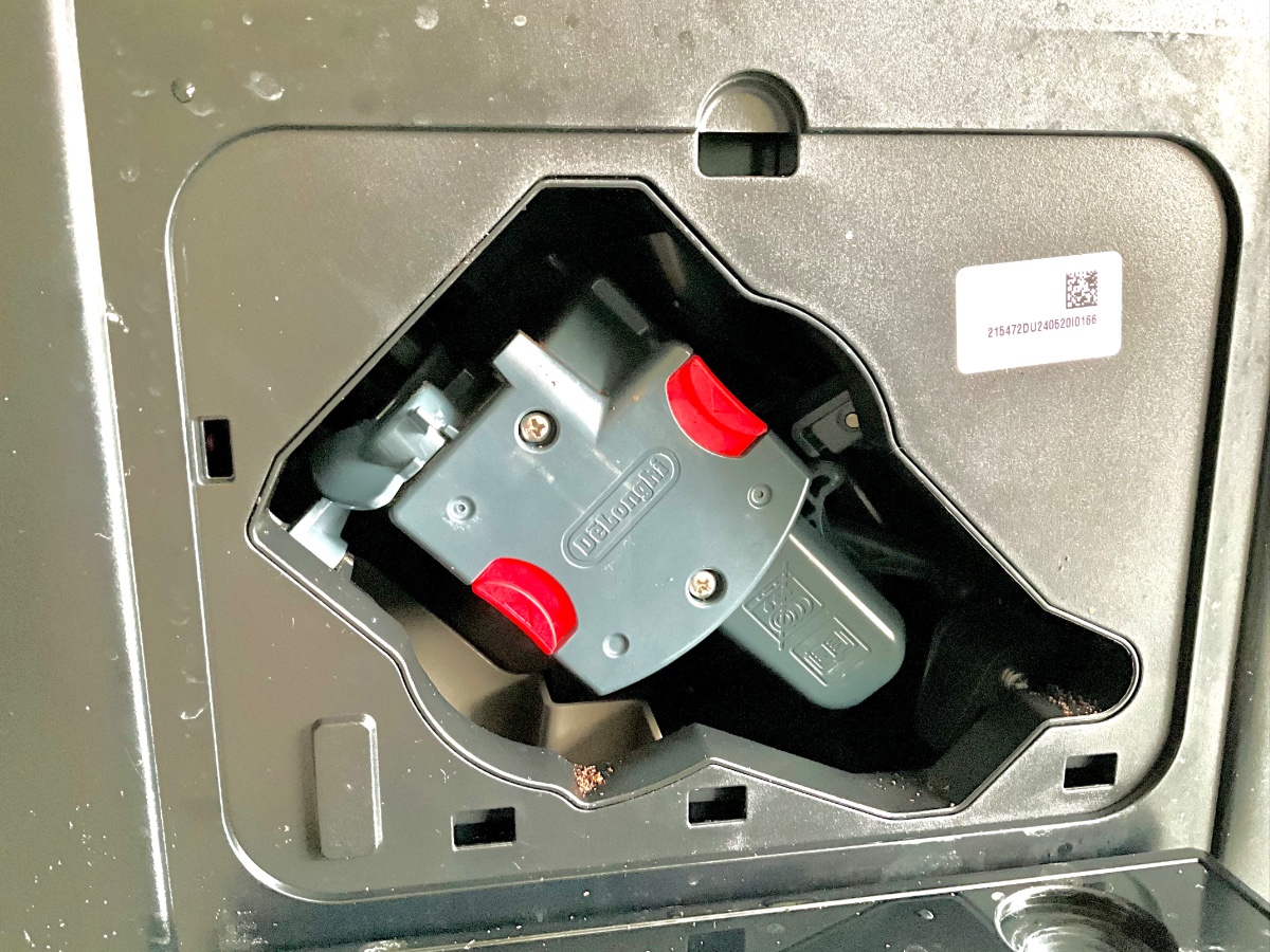 • Wie @raikem schon schrieb, die Brühgruppe ist nicht weit genug unten. Kann man deutlich sehen, da der Hebel, der den Tresterauswurf betätigt, noch halb betätigt ist. Wurde die Maschine eventuell per Hauptschalter ausgeschaltet, obwohl die Brühgruppenendstellung noch nicht erreicht war? Was passiert wenn du die Maschine einschaltest?