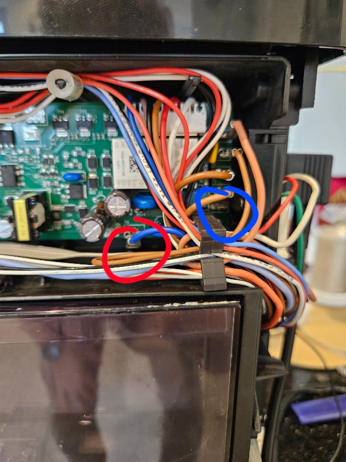 Dann gibt es auf der rechten Seite (Foto 3) zwei Möglichkeiten, rot und blau. Habe ich eines der Kabel, egal welches, wie oben beschrieben, links abgeklemmt und verbinden das andere mit rot, fängt das Mahlwerk sofort an zu mahlen. Stecke ich es in blau, passiert nichts und die Meldung kommt weiterhin nach Versuch einen Kaffee herzustellen.