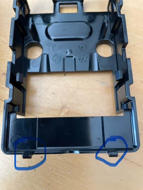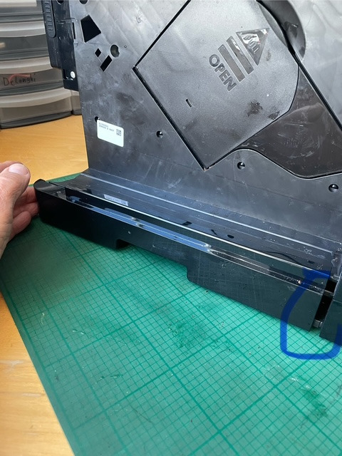 3. Bild 4. Die kleine Seitenwand (Tankseite) nach vorne schieben. Vorsicht, siehe Bild, hat auch noch Rastnasen. Ich habe das nach vorne geschoben und dann seitlich rausgefummelt.