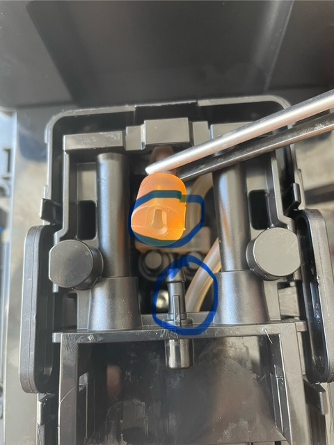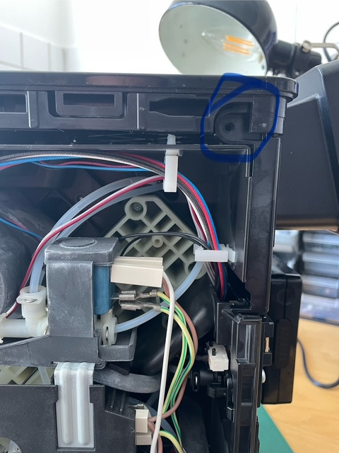 6. Bild 7,8,9,10. Von dem Kaffeeauslaufschieber den Chromdeckel abziehen. (wird mit Magneten gehalten). Dann Kaffeeauslauf abziehen. Der Rahmen ist wieder mit Rastnasen befestigt. Mit einem Schraubenzieher raushebeln. Jetzt den Zulaufschlauch abziehen (Vorsicht, der hat eine ganz bestimmte Position). Die Torxschraube lösen, die hält den Schieber an der Front. Dann abziehen.