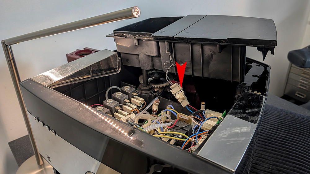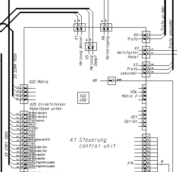 Die zwei Schrauben an der Tassenablage lösen und diese hochziehen und nach hinten schieben. Damit kommt man an die Platine und zb. den Anschluss X3