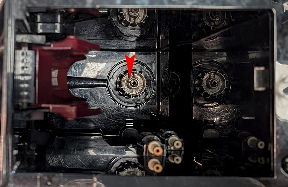 Um den Motor der Brüheinheit auszubauen diesen Sprengring lösen, das Zahnrad nach oben abziehen und die darunter liegende Gummischeibe abnehmen.