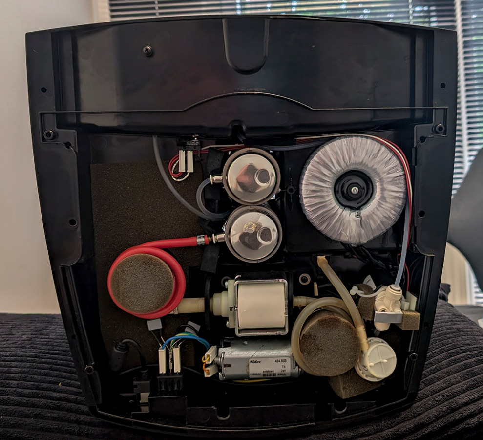 Ich habe bei der Suche nach einer Anleitung die Maschine zu öffnen festgestellt das es zu diesem Modell nichts gibt. Hier also ein paar Bilder von meiner Exkursion, teilweise Details in den Antworten weiter unten - Have Fun!