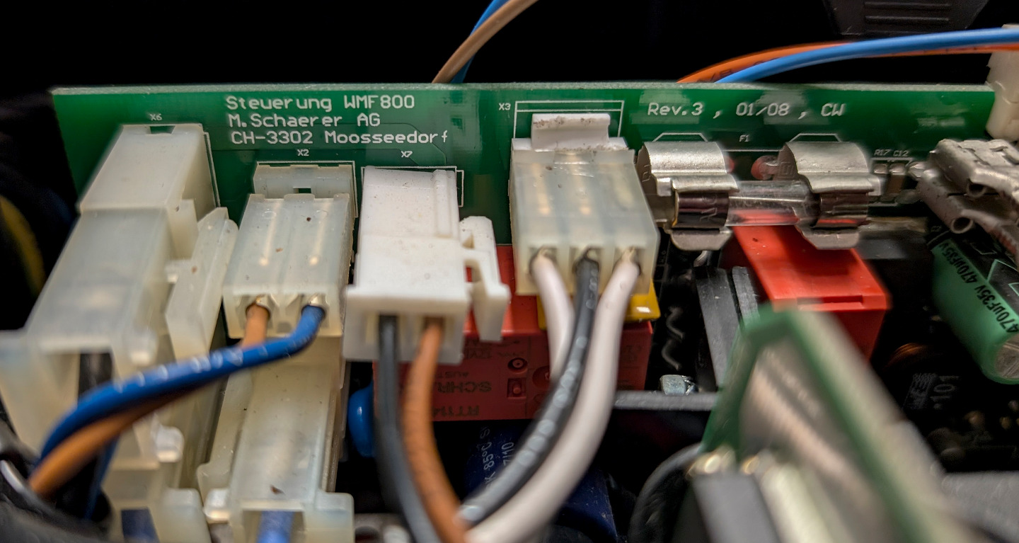 Ich habe eine WMF 1000 Pro S Barista (03 0510 0002) von 2011 (Brüheinheit von oben) aus der Bucht geholt, Fehlermeldung "Maschine heizt auf". Es erscheint außerdem die Anzeige "Brüher einsetzen" obwohl die Brüheinheit eingesetzt ist. Der Motor macht mit und ohne Brühgruppe keine Indexfahrt oder irgendeine Bewegung. Platine ist eine WMF800 Rev.3, 01/08, CW, (Scheinbar kompatibel mit WMF800/1200F, benötigt aber ggf. andere Software)