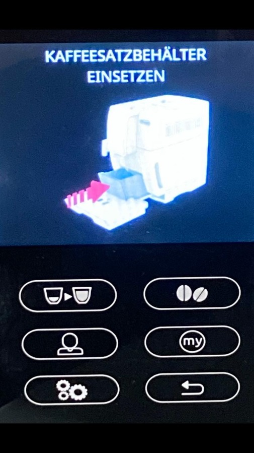 Also der Behälter ist natürlich mittlerweile geleert und ist auch drin, doch es zeigt immer noch "Kaffeesatzbehälter einsetzen" an. Auch nach dem ich die Maschine paarmal schon aus/angeschaltet habe, oder Netzstecker gezogen und wieder rein, usw., zeigt es sofort immer noch die Meldung "Kaffeesatzbehälter einsetzen" im Display an. Die Maschine gibt also auch anderweitig keinen weiteren Mucks von sich.