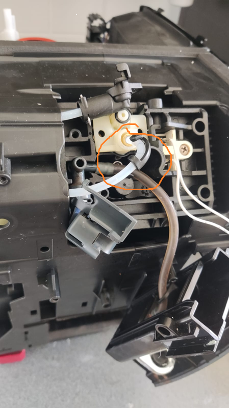 Ich habe darauf hin die Maschine geöffnet und habe ein etwa 4 CM großes Kalkstück im Schlauch im Bild entdeckt und entfernt (mit Draht).