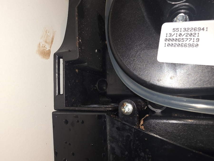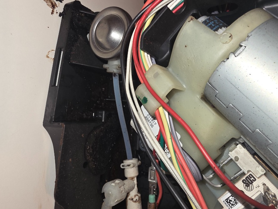 Ich habe daraufhin die Seitenklappe geöffnet und während des Bezugs beobachtet, was passiert. Es scheint nicht von den sichtbaren Schläuchen zu kommen – die sehen soweit in Ordnung aus (auch wenn einer etwas verschmutzt ist). Stattdessen sieht man, dass von oben rechts im Inneren langsam Kaffee herunterläuft. Dieser sammelt sich unten und tritt dann mit der Zeit durch kleine Öffnungen nach außen aus.
